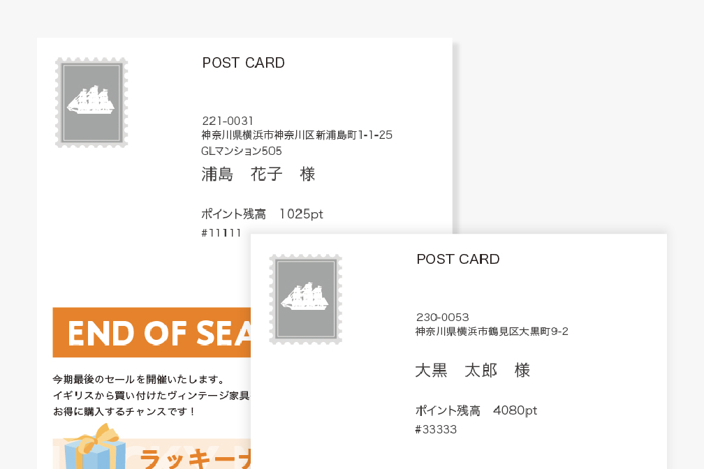 DMを受け取る方それぞれに異なる情報を訴求できます。フルカラーも対応可能なため、商品写真や色が付いた図の差し替えに適しています。ターゲットの購入履歴に合わせて商品を差し替えたり、店舗数の多い業種であれば最寄りの店舗を個別に案内することもできます。