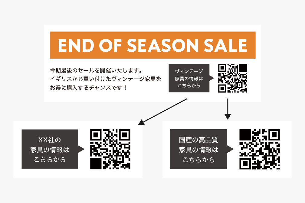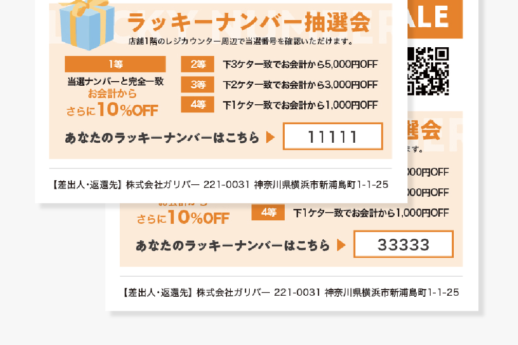 ターゲットごとに商品写真やキャンペーン情報、QRコードなどを差し替えて印刷・印字する手法です。